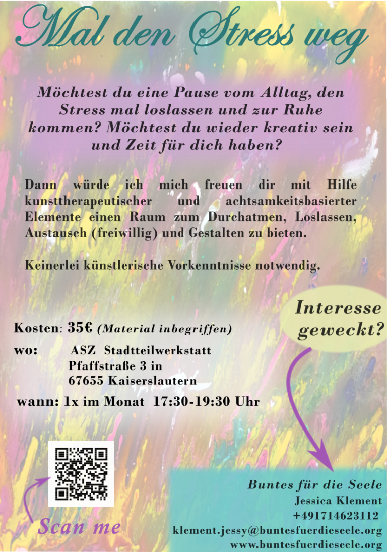 „Mal den Stress weg“ verbindet kunsttherapeutische Elemente mit achtsamkeitsbasierten Übungen, um dir Raum zum Durchatmen, Loslassen und Gestalten zu bieten.